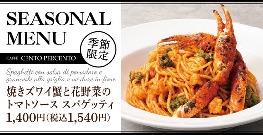 久しぶりに会う友人や家族との集まりが増える年末年始に相応しい、華やかな一皿「焼きズワイ蟹と花野菜のトマトソース スパゲッティ」を、ホームセンターを中心に出店し本格イタリアンで日常に上質感を味わうカジュアルレストラン「チェントペルチェント」全店にて2024年12月4日(水)より期間限定で販売いたします。