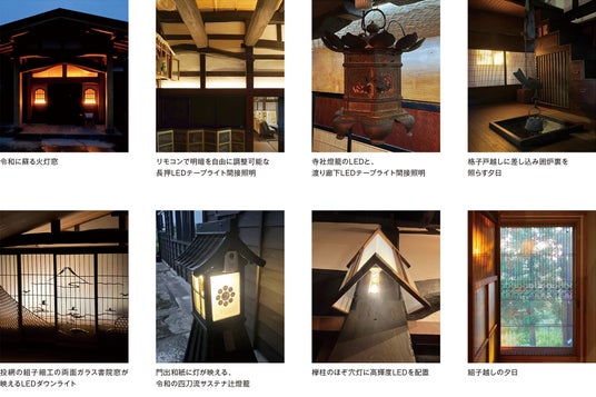 シン・陰翳礼讃は、承継樓において、持続可能な光源と、古民家ならではの造作を新結合させることで新しく陰翳礼讃を蘇らせた手法です。陰翳礼讃は、谷崎潤一郎の言葉で、文字どおり、陰翳を敬い褒め讃えることです。そして、この陰翳とは、光の直接当たらない暗がりのことですが、真っ暗な闇ではなく、光の存在をわずかに感じるぼんやりとした薄暗がりの状態を意味します。承継樓では、古民家ならではの優美な造作と、LEDや太陽光発電などのサステナブルな光源を新結合することで、令和のシン・陰翳礼讃を創造、提起しました。