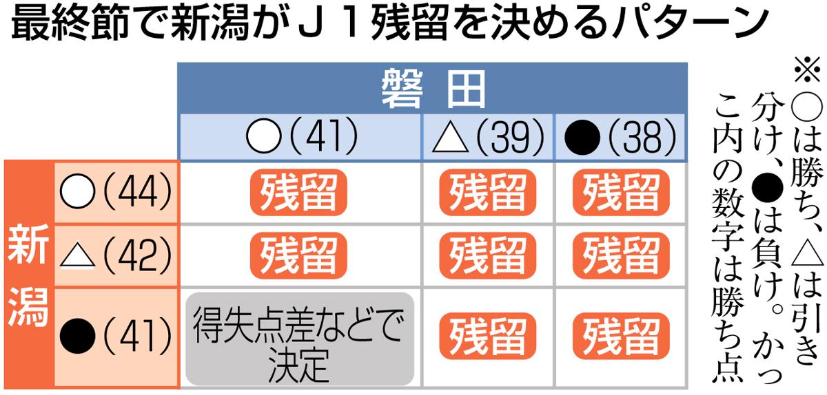 新潟と磐田の勝ち点差は3で、磐田は引き分けか負けで降格が決まる。新潟が負け、磐田が勝った場合は勝ち点41で並ぶため、まずは得失点差での勝負となる。柏も負ければ同41で並ぶが、得失点差で残留の可能性は高く、新潟と磐田の事実上一騎打ちの構図となっている=表参照=。