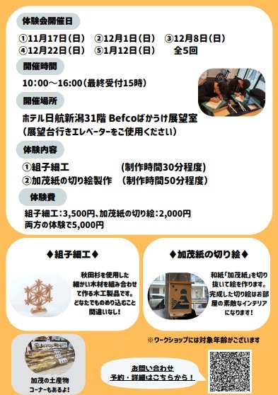 特産品を販売。12月22日、組子細工と加茂紙の切り絵制作体験。組子細工3500円、切り絵2000円。詳細は加茂市ホームページ。市商工観光課、0256(52)0080=平日のみ=。
