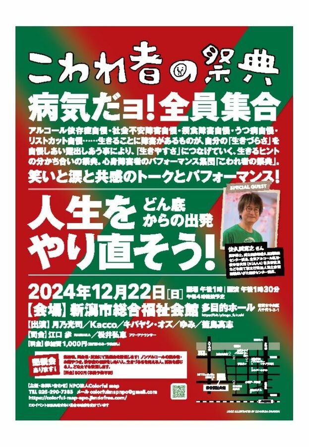 アルコール依存症やひきこもりなど、「生きづらさ」を感じる当事者がトークやパフォーマンスを通じて肯定的に体験を分かち合う。そううつ病や摂食障害を経験したKaccoさんら5人が出演する。