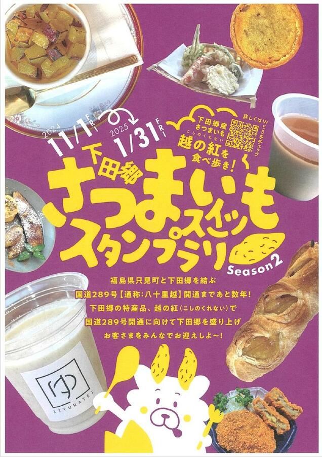 8店舗が参加し、それぞれチーズケーキやコロッケなどサツマイモを使ったメニューを用意。購入してもらえるスタンプを全て集めると、特産品詰め合わせセットと交換できる。