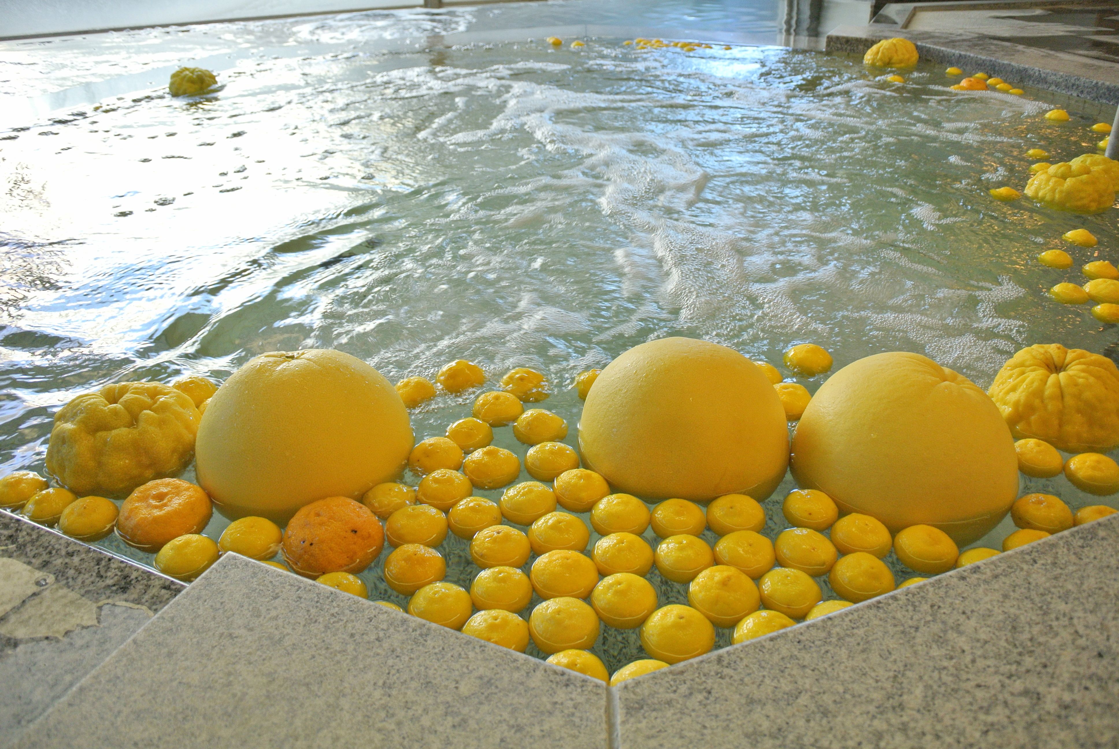 冬至に合わせ、住民から譲り受けたゆずと、世界最大級のかんきつ類「晩白柚(ばんぺいゆ)」を浮かべる。