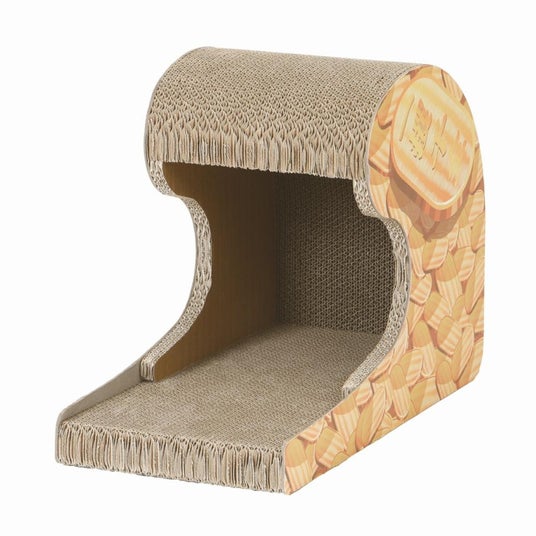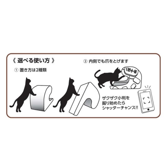 ねこちゃんが爪をとぐことで、小判を掘っているように見える爪とぎです。置き方は2種類。平らな面でもカーブしている面でも爪をとげます。ねこちゃんが喜ぶマタタビ粉付き。
