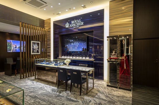 ロイヤル・アッシャー銀座本店の内装を再現したコーナーで、ブランドの世界観を存分にお楽しみいただけます。さらに、日本国内に数点しかない、大変希少な英国王室の王冠と王笏のレプリカが特別な専用ケースに飾られます。限られた店舗でしか見ることのできないレプリカからは、英国王室の壮大な歴史とロイヤル・アッシャー社の輝かしい功績を間近に感じることができます。