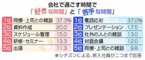 フレッシュマンは雑談が好き-。シチズン時計(東京)が今春の新入社員400人を対象に実施したインターネット調査でこんな姿が浮かび上がった。仕事に関する時間のイメージを尋ねた結果、37・3%が会社で過ごす時間で最も好きなのは「同僚・上司との雑談」...