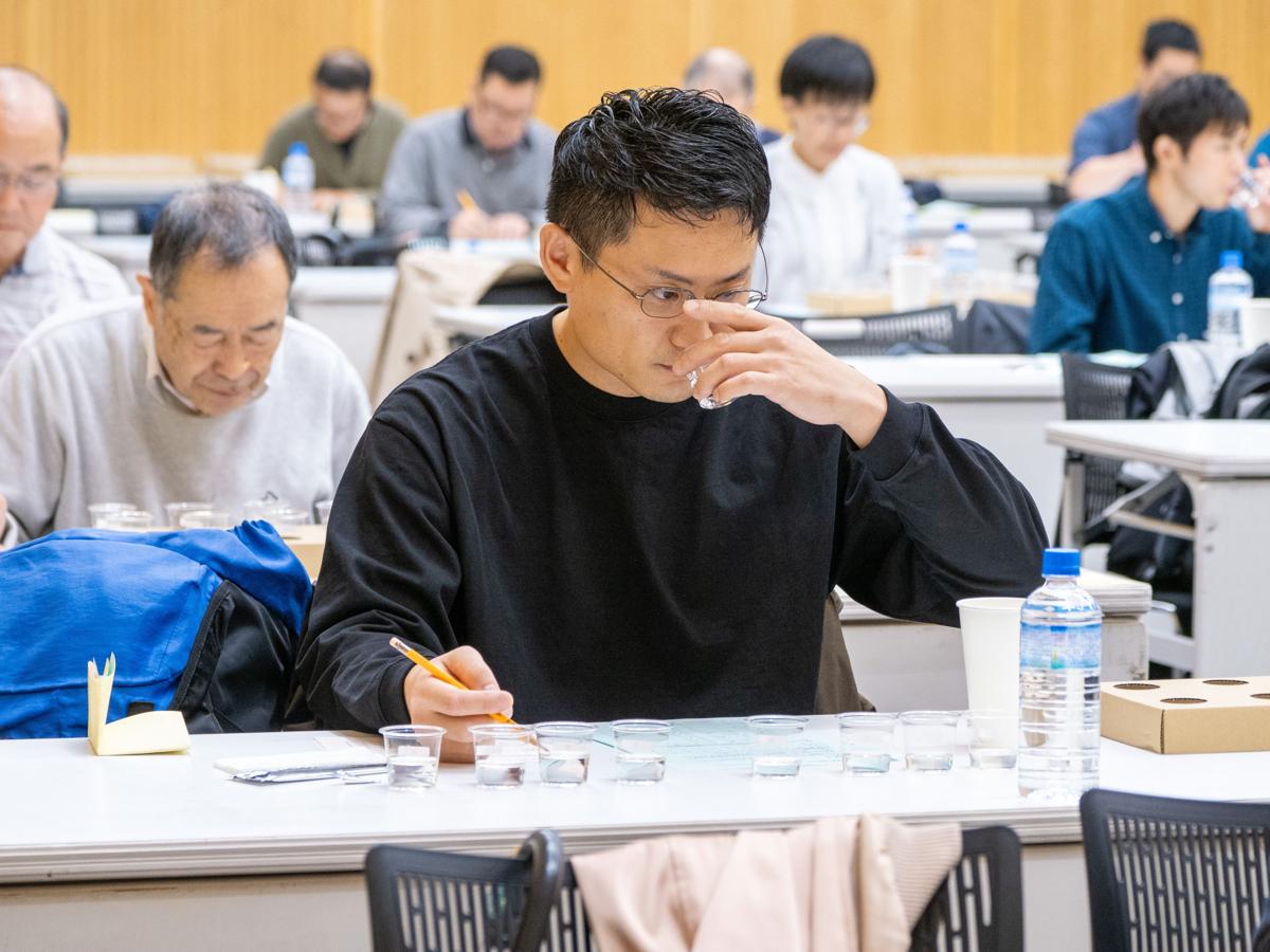 試験官の合図で一斉にきき酒をスタート。時折水を飲み、味をみた後に酒を吐き出す人あり、酒を眺めて色味を確かめる人あり。無言の会場に、カップを置くカタカタという音が響き渡る。受験者は酒の味を見定め、手元の紙に次々とメモしていく。