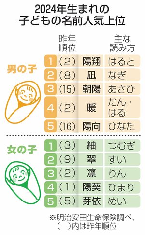 社会 2024年・子どもの名前ランキング、男の子は「陽翔」 女の子は「紬」がトップ!「グローバルネーム」も増加 2024/12/22 10:00 明治安田生命保険は、2024年に生まれた子どもの名前ランキングを発表した。男の子の1位は「陽翔」(はると=主な読み方)で、7年ぶりに1位となった。女の子は「紬」(つむぎ)で3年ぶりの首位。明治安田生命... 残り361文字(全文:462文字) ここから先を読むには 続きを読む(会員登録する) 続きを読む(ログイン) 新潟日報朝刊を購読していますか? はい いいえ トップページで最新情報を見る 関連ニュース 【速報】胎内市の鳥インフル疑い、遺伝子検査で陽性 県内・胎内... 8:06 鳥インフル防疫作業で心身不調、新潟など20県職員が相談・過去... 5:00 女装して病院の更衣室に侵入した疑い、長岡署が28歳男を逮捕 11/8 銀歯に使う「アマルガム」34年末に禁止、水銀規制の水俣条約会... 11/8 クマ人的被害の7割は人の生活圏で・7~9月 25年度上半期は... 11/8 任意保険ない車と事故…補償足りないケースも、被害者「泣き寝入... 11/8 八海山(南魚沼市)下山中に体調不良、スリランカ国籍の女性救助 11/8 萬代橋近くの高さ制限バーにトラック引っかかる・新潟市中央区 ... 11/8 10日は大雨注意、11日にかけ標高の高い所で雪の可能性[新潟... 11/8 胎内市の養鶏場で高病原性鳥インフルエンザ疑い、確定なら県内今... 11/8 お年寄りの交通事故防ごう!高齢者向けの運転教室、専用ゴーグル... 11/8 地震が起きたらどうする?阿賀野市・神山小で防災授業 「命を守... 11/8