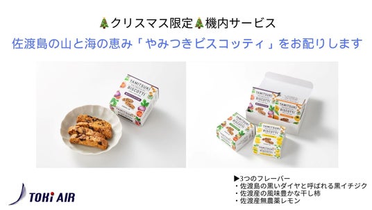 トキエアは今年1月の新規就航から継続して、新潟県ゆかりのお菓子を機内にてお配りしてまいりました。今回クリスマスをトキエアで過ごすお客様限定で、佐渡島の山と海の恵みがたくさん詰まった「やみつきビスコッティ」をお配りします。