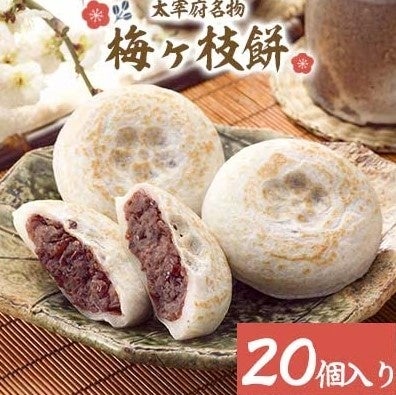 「太宰府名物 梅ヶ枝餅」は浄妙尼(じょうみょうに)という老女が、不遇の日々を送っていた菅原道真公を哀れみ、餅に梅の枝を添えて贈ったのが由来とされています。参道周辺には梅ヶ枝餅の販売店が30軒以上あり、いずれかのお店で作られた選りすぐりの梅ヶ枝餅が届きます。もち米とうるち米で作った生地に小豆あんを包み、こんがりと焼き上げています。
