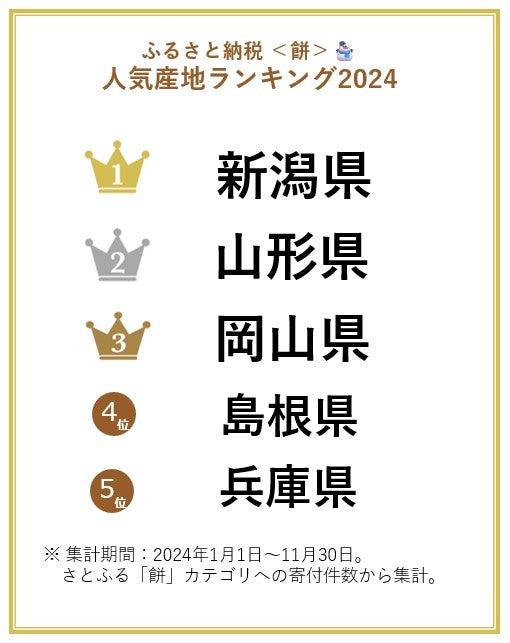 TOPIC1 米どころである新潟県が「餅人気産地ランキング2024」で1位に!2位は「お米人気産地ランキング2024上半期」で1位の山形県。お米がおいしい地域のお餅が人気