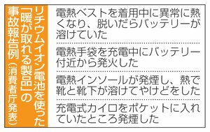 社会 くらし・文化・おでかけ 気を付けて!就寝中のスマホ充電 リチウムイオン電池から発火の恐れ…電熱グッズも事故原因に 2025/1/5 15:00 スマートフォンなど多くの製品に使われている「リチウムイオン電池」の過熱や発火事故が起きているとして、消費者庁がウェブサイトに注意点を掲載した。「充電はなるべく様子が確認できる場所で」とし、特に就寝中に... 残り374文字(全文:475文字) この記事を読むには 会員登録が必要です 無料で会員登録して続きを読む 会員の方はこちら(ログイン) 会員のご案内 レギュラープラン【おすすめ】 すべての記事と紙面ビューアー(電子版)を無制限にお読みいただけます。 月額3,300円(税込み)。 新聞を購読されている方は無料です。 ライトプラン 無料記事と有料記事(レギュラープラン限定記事を除く)を月50本までお読みいただけます。 月額1,650円(税込み)。 無料会員 無料記事と有料記事を月2本までお読みいただけます。 無料で会員登録して続きを読む トップページで最新情報を見る 関連ニュース 新米と相性バッチリ“昔ながらの味”♪津南町の雪深さが育んだ「... 15:15 連合新潟が定期大会、小林俊夫会長を再任 組織力強化など方針承... 15:00 佐渡ジオパーク、再認定調査員が視察 指摘受け見どころ厳選、海... 14:30 [能登半島地震の液状化対策事業]自治体単位の説明会、新潟市が... 14:00 高速を逆走した埼玉の男また逆走か 湯沢町でパトカーに車を衝突... 13:35 デザイナーや写真家…多彩な人材紹介!燕市の複合施設「まちトー... 13:30 湯沢町、車とクマの衝突事故相次ぐ 13:15 最低賃金の再引き上げを、新潟県労連など3団体が要請 985円... 13:00 [クマ目撃情報]村上市、関川村、胎内市、五泉市、阿賀町、見附... 12:45 上古町商店街「カミフル門前市」で新潟小児童が出し物企画!クイ... 12:30 「半端なく数字伸びている」国も重視のコンテンツ産業、1拠点平... 12:00 固い皮をくりぬき、ちょっと怖いランタン完成!東京・銀座で十日... 11:30 特集・連載 県内でインフルエンザが流行期入り、昨年より約3週間早い 魚沼... 10/30 【高校入試・新潟】最新情報&お役立ち情報まとめ 倍率・過去問も 7/28 漫画で知る「うつ病」とは? 若手社員が休職→通院→復職するま... 6/13 [紅葉スポット×花スポット]新潟県内の紅葉や花畑、映える名所... 5/29 【猫動画・新作あり】新潟県内「猫のいる店」♡モフモフに触れる... 10/29 [WEリーグ]今からでも間に合う!アルビレックス新潟レディー... 8/14 【機動戦士ガンダムジークアクス】鶴巻和哉監督(五泉市出身)が... 8/4 [プロ野球ドラフト会議]プロ志望届、新潟県関係は7人が提出!... 10/9 Otona+ 今や「1兆円市場」冷凍食品はなぜ愛されるのか?県民に人気の商... 10/28 【動画あり】新潟の夜空染めたオーロラ、実は江戸時代にも目撃さ... 10/21 卵子提供で2児出産、自助グループ立ち上げ当事者に寄り添い…芸... 10/14 山頂に神社、小学校の屋上…各地に点在する「三角点」って?形は... 9/30 「アクシアル」「コメリ」などプライベートブランド開発の裏側お... 9/23