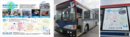 メッセージは、2024年7月に開催した、佐渡を舞台に日本海の歴史から未来の海を考える1泊2日の体験学習イベント「新潟の海を守り隊!」に参加した県内の小学5・6年生のアイデアによるものです。きれいな佐渡の海を未来に残すために一人一人が出来ることや、これから海をどうしていきたいかについてアイデアを出し合い、メッセージやイラストで表現しました。メッセージを載せたバスは、来年2月末まで運行予定です。