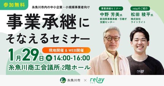 事業承継マッチングプラットフォーム「relay(リレイ)」を運営する株式会社ライトライト(宮崎県宮崎市 / 代表取締役:齋藤 隆太 )は新潟県糸魚川市の第三者承継の推進に向け、糸魚川市内の後継者募集に特化した特設ページ「relay the local 糸魚川市」の共同運営を行っている新潟県糸魚川市と、2025年1月29日(水)に小規模事業者・個人事業者向けの事業承継セミナーを開催することをお知らせいたします。