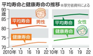 社会 2022年の健康寿命、男性72・57歳、女性75・45歳でほぼ横ばい・厚労省調査 ウイルス禍が影響か 2025/1/1 22:00 厚生労働省は、介護を受けたり寝たきりになったりせずに日常生活を送れる期間を示す「健康寿命」が、2022年は男性72・57歳、女性75・45歳だったと公表した。前回調査の19年(男性72・68歳、女性... 残り530文字(全文:630文字) ここから先を読むには 続きを読む(会員登録する) 続きを読む(ログイン) 新潟日報朝刊を購読していますか? はい いいえ トップページで最新情報を見る 関連ニュース 喫煙率14・8%過去最低、「たばこをやめたい」25・0% 厚... 2024/9/16 新型コロナウイルス国内累計死者10万人超、新潟県は1200人... 2024/6/6 津波到達前後に各地で車渋滞、浸水想定区域内でも…青森震度6強... 12/13 拉致問題「高市総理のもとであらゆる手段尽くす」と木原官房長官... 12/13 [Q&A]災害時のペット避難、準備する物は?一緒に避難できる... 12/13 中高一貫の県立中等教育学校で入試、大雪避けて初の12月実施 ... 12/13 [鉄道運行情報]12月14日、JR越後線・弥彦線の一部で運転... 12/13 住宅地の柿の木に熊とどまる、緊急銃猟で駆除・南魚沼市 市内2例目 12/13 「ブラックジャックによろしく」などの佐藤秀峰さんの作品、啓発... 12/13 アスベスト被害者や家族対象の無料電話相談が12月18、19日... 12/13 スポーツ、文化分野での貢献に感謝!新潟市が功労者を表彰 20... 12/13 環境と騒音に配慮!津南町で電動建設機械による除雪作業試行 環... 12/13
