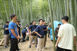 ワークショップでは、長さ40センチほどの竹を使った。冨田さんらのサポートを受けながら、参加者がのこぎりや鉈(なた)で花器の形に竹を加工。きれいに竹が割れると歓声が上がった。縁起物の植物の意味も教わりながら、思い思いのデザインで器に差し込み完成させた。