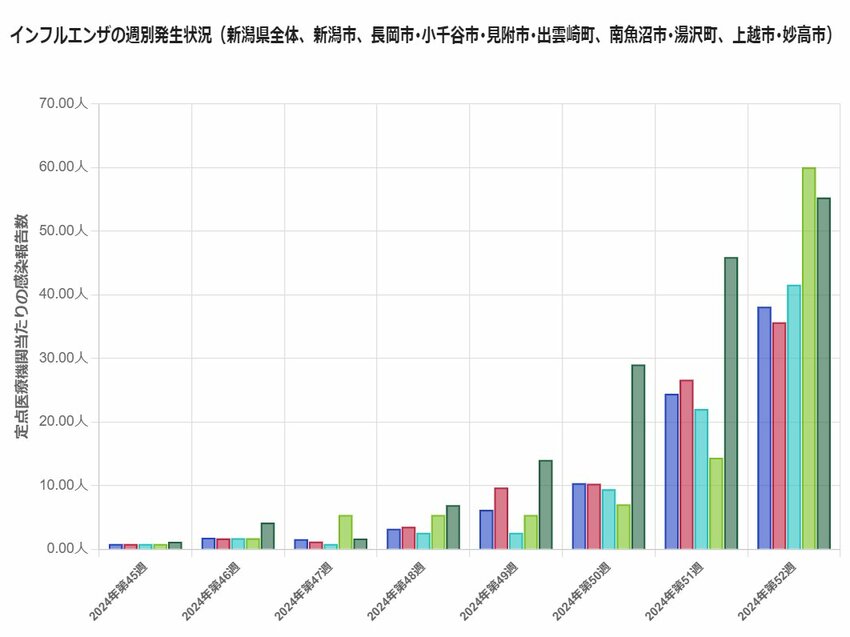 デジタル限定 社会 地域医療 感染症 [新潟県の地域別感染症情報]インフルエンザが警報レベルに!報告数1・5倍に増加、南魚沼市や湯沢町で急増 (2024年12月23日~29日) 2025/1/8 18:00 11月第2週から12月第4週にかけてのインフルエンザの週別発生状況。青いグラフは新潟県全体、赤は新潟市、水色は長岡市・小千谷市・見附市・出雲崎町、薄い緑は南魚沼市・湯沢町、濃い緑は上越市・妙高市の感染報告数(定点医療機関当たり) 新潟県内の感染症の発生状況をお知らせします。インフルエンザや新型コロナウイルス感染症、溶連菌感染症など19種類の感染症の患者数の増減を、地域別に確認できます。 ▼2024年12月23日~29日 ↑タップ・クリックするとご覧になれます トップページで最新情報を見る 関連ニュース 新型コロナウイルス、新潟県は全国最多4・85人 1医療機関当... 11/29 【インフルエンザ流行】新たな変異株「サブクレードK」流行か、... 11/28 新潟県がインフルエンザ警報を発令 前週から倍増、変異株の影響か 11/27 新潟県内インフルエンザ患者数急増、前週の約2・2倍 感染力の... 11/20 県がインフルエンザ注意報、昨季より1カ月早く 6週連続増、魚... 11/14 インフルエンザ流行期入りの県内、報告数が倍増 最多は三条保健所管内 11/6 県内でインフルエンザが流行期入り、昨年より約3週間早い 魚沼... 10/30 [新潟県の地域別感染症情報]マイコプラズマ肺炎、インフルエン... 10/23 インフルエンザ予防接種、鼻にスプレーする“痛くない”ワクチン... 10/23 [新潟県の地域別感染症情報]警報発令中のりんご病、前の週より... 10/16 「百日ぜき」2025年累計患者数が初の8万人超え、新潟県は全... 10/15 [新潟県の地域別感染症情報]新型コロナウイルスが増加傾向に ... 10/9