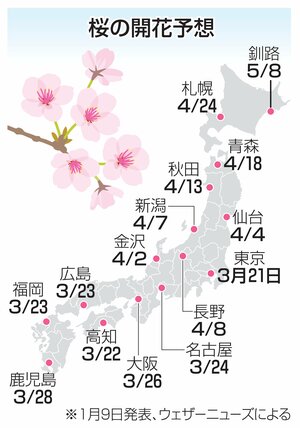 社会 2025年の桜はいつ咲く?新潟市は4月7日の予想 西-東日本で平年並みか 2025/1/10 10:45 民間気象会社ウェザーニューズ(千葉市)は1月9日、2025年の桜(ソメイヨシノ)の開花日の予想を発表した。西日本から東日本は平年並みの予想で、3月21日の東京都心をトップに22日に高知市と横浜市が続き、3月... 残り275文字(全文:379文字) ここから先を読むには 続きを読む(会員登録する) 続きを読む(ログイン) 新潟日報朝刊を購読していますか? はい いいえ トップページで最新情報を見る 関連ニュース 冬の人気観光地、国内トップに新潟市選出!2025年旅行サイト... 12/11 [停電情報]新潟市西区五十嵐1の町などで一時900軒(12月... 12/11 【村上祭の屋台行事】無形文化遺産登録で市民歓喜!「村上の誇り... 12/11 欠員が過去最多の83人…県内公立小中学校教員・12月1日時点... 12/11 [新潟県の天気・気象情報]19日ごろから平年より2.6度以上... 12/11 [新潟県の天気・気象情報]高波と風雪に注意…12日は冬型の気... 12/11 遠清商事(阿賀野市)を指名停止、技術者確保できず契約辞退…新... 12/11 あなたの意見が詐欺対策に!新潟県警がアイデア募集中 「+」か... 12/11 バイクで集団暴走や信号無視繰り返した疑い、上越市の18歳男子... 12/11 [クマ目撃情報]南魚沼市(12月11日) 12/11 クマ対策や避難所の在り方などどうする?新潟市議会が議会報告会... 12/11 真珠湾攻撃から84年、ホノルルで追悼式典 姉妹都市・長岡市の... 12/11