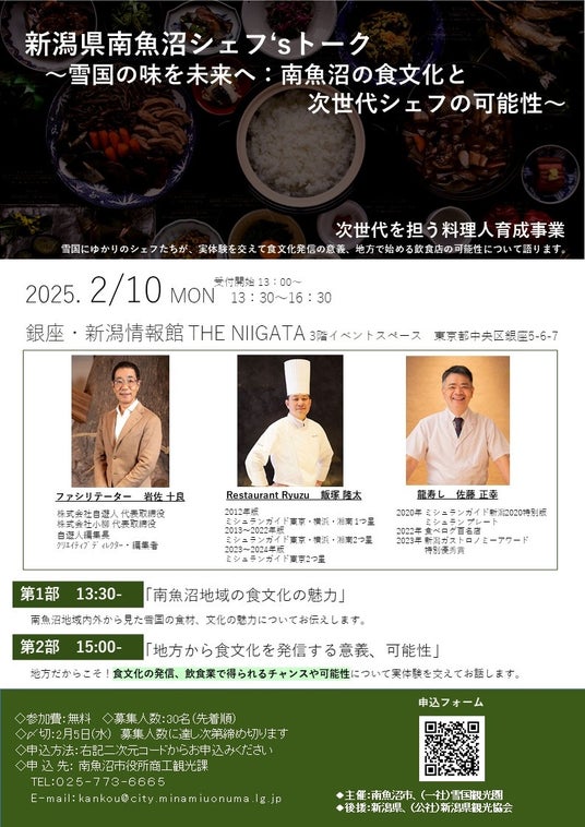 2025年2月10日(月)、南魚沼市は次世代を担う料理人に向けて雪国の食文化の魅力、そこで飲食店を始めることの可能性について語るトークイベントを「銀座・新潟情報館 THE NIIGATA」にて開催します。将来、地方で飲食店の開業を考えている方、新たなチャンスを探している方はぜひご参加ください。
