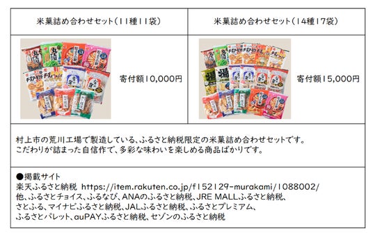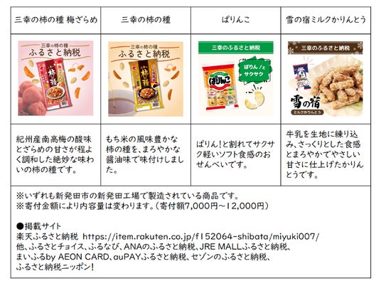 三幸製菓株式会社(本社:新潟県新潟市北区、以下当社)は、製造工場を置く新潟県新発田市及び新潟県村上市のふるさと納税の返礼品として、米菓・かりんとうの提供を開始いたしました。