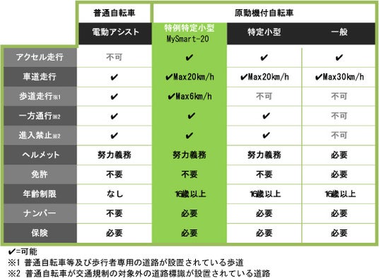 一方通行: 「MySmart20」は、一方通行(自転車を除く)の道路を走行することができます。特定原付として車道走行が基本ですが、交通規則を遵守しながら一方通行の道路を走行できます。