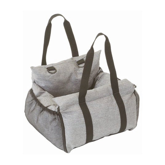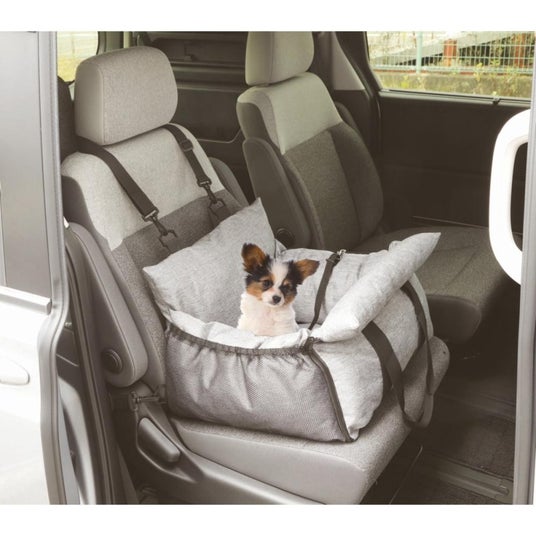 1つ目は「Pet ami ドライブベッド グレー」。カーシートに取り付け、車移動を快適にするペットキャリーです。左右のファスナーを開けるとベッドに早変わりし、ふかふかの中綿で快適な座り心地となっております。併せて室内でもご使用いただくことで、災害発生時にペットにストレスをかけることなく移動が可能です。