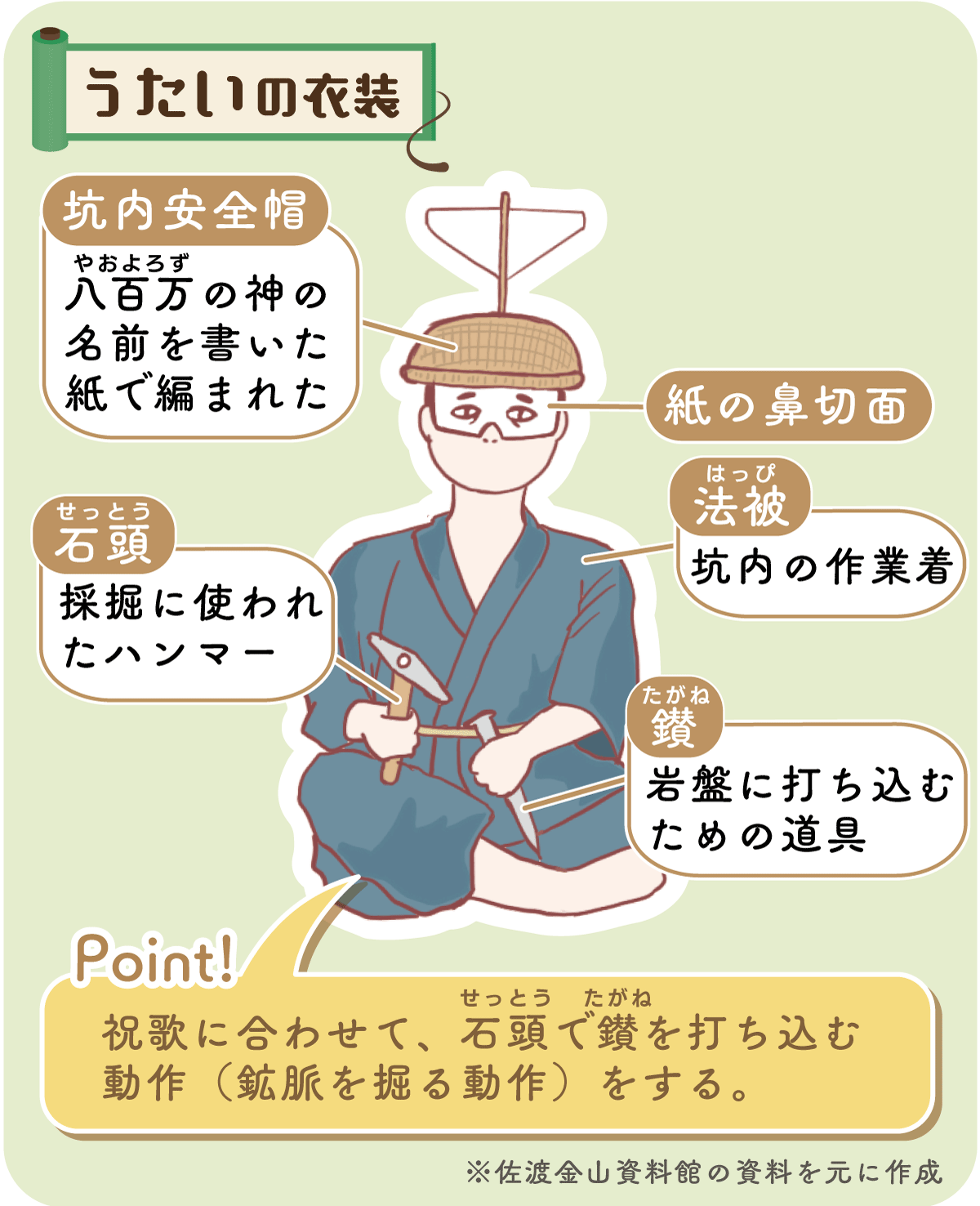 「うたい」がたるの音に合わせてうたう祝歌は、佐渡や金山の繁栄を願う内容となっています。「岩の出先に三階松植えて 鶴が黄金の巣をやかける」は、「岩の出先にはおめでたい松の木があり、その上に鶴が黄金色の巣を作っている」という意味。「松」や「鶴」といった、おめでたい言葉が並びますが、実際には鶴は木の上に巣を作らないのだとか。しかし、縁起が良いので歌詞に含んだそうです。