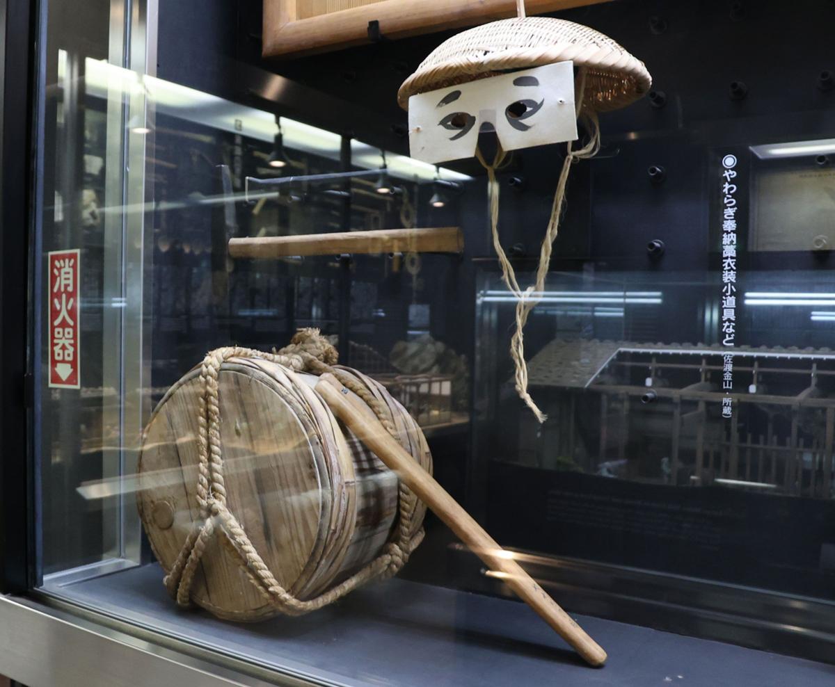 そこには、神社の神事のような動きをする人形たちが!これは、江戸時代に始まった「やわらぎ」という祭礼で、鉱脈を発見した際に坑道開きのお祝いをしている様子だそう。古語の「柔らぐ」「和らぐ」が由来とされ、「岩盤が柔らかくなるように」「山の神様の心が和らぐように」と金山で働く者たちの願いが込められています。やわらぎの演者は、山師などが演じる「親方」1名と、金掘り労働者が演じる「うたい」と「たるたたき」数名で構成されています。