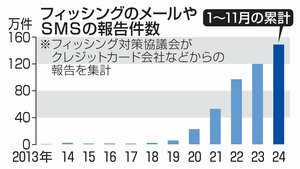 偽サイトに誘導してクレジットカード情報を盗む「フィッシング実在する企業や組織の名前をかたって、偽メールやショートメッセージサービス(SMS)を送り付け、IDやパスワード、名前、住所、銀行口座番号、クレジットカード番号などを盗む行為。メールなどに記載されているURLをクリックすると偽サイトに誘導され、個人情報を入力させられる。(※ページ下部に詳細)」を狙い、金融機関などを装って送り付けられたメールやショートメッセージサービス(SMS)の報告件数が2024年、過去最多となることが、民間監視...
