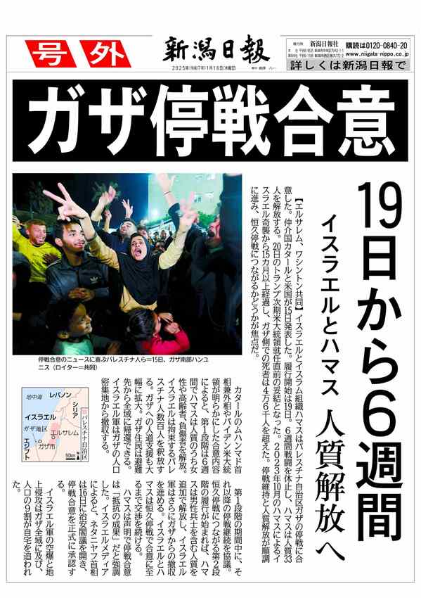 【号外】ガザ停戦合意 2025/1/16 6:50 (最終更新: 2025/1/16 9:22) PDFで号外を見る トップページで最新情報を見る 関連ニュース 【号外】新潟県知事が柏崎刈羽原発再稼働を容認 11/21 【号外】日経平均初の5万円台 10/27 【号外】新首相に高市早苗氏、女性で初めて選出 10/21 【号外】燕市の新市長に前市議の佐野大輔氏 10/20 【号外】北信越高校野球・帝京長岡が優勝 10/19 【号外】公明党が連立政権離脱へ 10/10 【号外】ガザ全人質解放へ 10/9 【号外】ノーベル化学賞に北川進京都大特別教授 10/8 ノーベル化学賞に京都大特別教授の北川進氏ら 10/8 【号外】ノーベル生理学・医学賞に大阪大栄誉教授の坂口志文氏ら3氏 10/6 【号外】自民党新総裁に高市早苗氏 10/4 【号外】石破茂首相が辞任の意向 9/7
