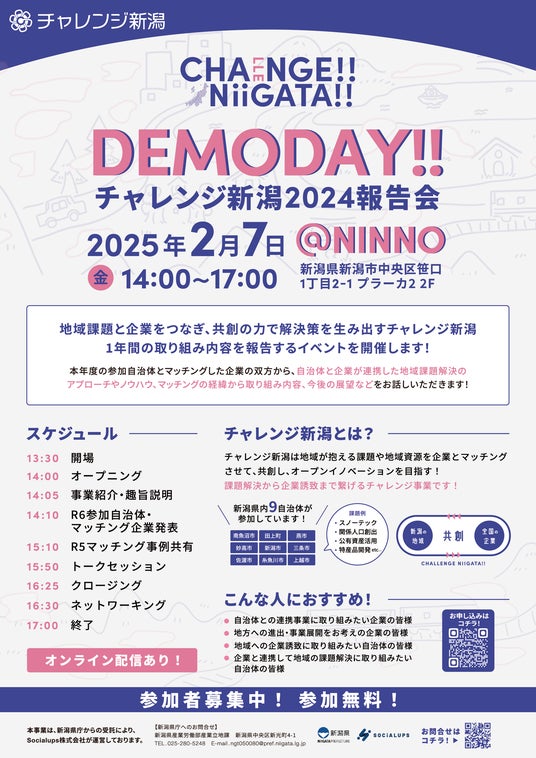 Socialups株式会社(本社:新潟県新潟市中央区、代表取締役社長:高瀬 章充)は、新潟県主催の地域と企業をつなぎ共創する「チャレンジ新潟」の2024年度報告会を開催します。