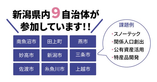 チャレンジ新潟は、新潟県内の市町村が抱える様々な課題や地域資源を企業とマッチングさせて共創し、オープンイノベーションにより課題解決から企業誘致まで繋げる事業です。