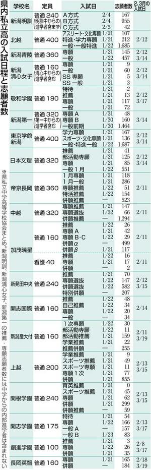 新潟県内私立高校の2025年度入試が1月21日、19校のうち16校で始まる。開志国際は22日、新潟第一は30日、新潟明訓は2月4日にそれぞれ始まる。県私立中学高等学校協会によると、20日までに24年度より254人多い、延べ1万5860人が志願した。