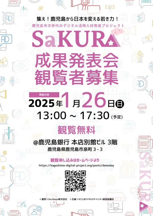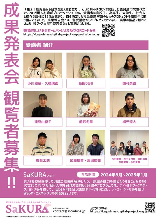 高校生・大学生など15名が参加し、デジタル技術を使って地域の課題を解決したり、地域の魅力を高めることができる若い人材を育成する約6ヶ月間のプログラムSaKURAの成果報告会を、鹿児島銀行 本店別館ビルで開催します。会場でぜひ成果を見届けてください。