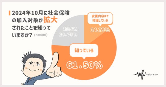 「2024年10月に社会保険の加入対象が拡大されたことを知っていますか?」という質問に対し、61.50%が「知っている」と回答。