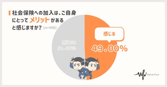 「社会保険への加入は、ご自身にとってメリットがあると感じますか?」という質問に対し、「メリットを感じる」と回答した方が49.00%、「メリットを感じない」と回答した方が51.00%で、ほぼ半々という結果に。