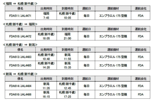 株式会社フジドリームエアラインズ(本社:静岡県静岡市、代表取締役社長:楠瀬 俊一、以下「FDA」)と日本航空株式会社(本社:東京都品川区、代表取締役社長:鳥取 三津子、以下「JAL」)は、2025年3月30日(日)よりFDAが新たに就航する福岡=札幌(新千歳)、札幌(新千歳)=新潟の両路線において、JALコードシェア便を設定します。