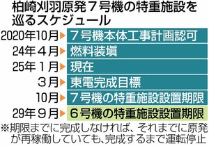 特重施設の完成は、詳細設計を示した工事計画について原子力規制委員会原発推進を担う経済産業省から安全規制の役割を分離させ、原子力規制に関する業務を一元化した組織。東京電力福島第1原発事故を受けて発足した。国家行政組織法3条に基づき、人事や予算を独自に執行できて独立性が高い「三条委員会」として環境省の外局に位置付けられる。衆参両院の同意を得て首相が任命する委員長と委員4人で構成する。から認可を受けることが前提となる。東電は2023年1月以降、工事計画を四つに分割して規制委に申請しているが、一部の申請内容についての審査がまだ始まっていない。