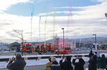 新潟市消防団秋葉方面隊が1月19日、新潟市秋葉区の商店街で出初め式を行った。消防車両約20台と消防団員ら約70人による行進などがあり、集まった人たちは勇ましい姿に見入っていた。