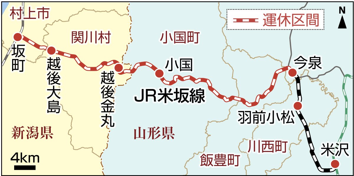 2022年8月の豪雨2022年8月3日から4日にかけて発生。新潟県によると住宅被害は村上市、関川村を中心に全壊8棟、半壊23棟、床上浸水889棟などの被害が出た。総降水量は村上市坂町で589ミリ(国土交通省観測)、関川村下関で569ミリ(気象庁観測)などと記録的な豪雨になった。人的被害は重傷者1人で、死者はいなかった。で被災したJR米坂線の復旧を巡り、JR東日本新潟支社の白山弘子支社長は1月22日の定例会見で、第三セクターなどによる運営やバス転換にした際の費用試算について「われわれが単独で数字を出すのは適切ではない」と述べた。JRは復旧後の運営方法として4案を示し、このうち、鉄道施設を自治体が保有する「上下分離方式」は地元負担の試算を明らかにしていた。