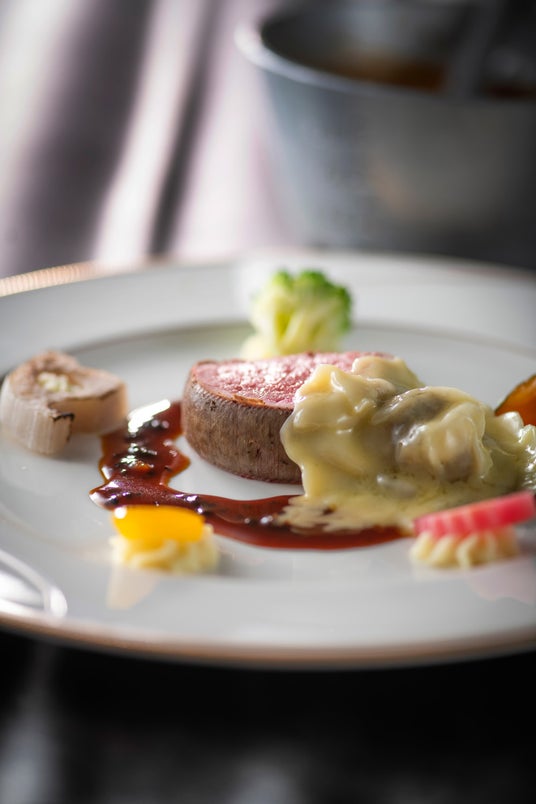 ・くびき牛フィレ肉のポワレ フォアグラとトリュフのラヴィオリ添え 彩り野菜の飾り