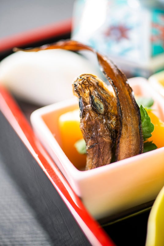 [前 菜] 長芋と冬菜かんずり酒盗掛け/ばい貝酒蒸し/メギス魚醤干し