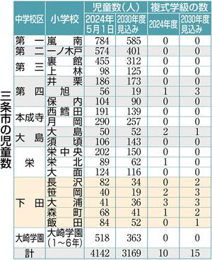 市教委によると、市立の小学校(義務教育学校1〜6年を含む)の児童数は2024年5月1日時点で4142人だが、30年度には3169人に減る見通しだ。小学校別では上林小、大...