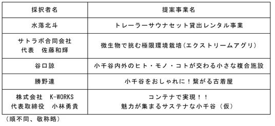 2025年1月19日に、事前の書類審査を通過した8者による審査会を実施し、本コンテスト募集要項に基づき厳正に審査を行った結果、下記の5者を令和7年度小千谷市チャレンジ支援事業補助金(最大100万円)の採択者に決定いたしました。