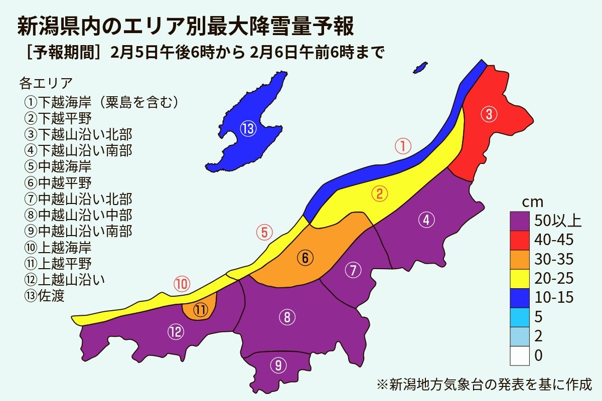 5日午後6時までに予想される24時間降雪量はいずれも多い所で、山沿いが中越で100センチ、上越で80センチ、下越で70センチ。平地が上、中越で50センチ、下越で40センチ。佐渡で30センチ。その後、6日午後6時までの24時間は、山沿いが中越で100センチ、上、下越で70センチ。平地が上、中越で50センチ、下越で40センチ。佐渡で30センチ。