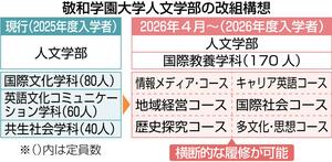 敬和学園大学(新潟県新発田市富塚)が、2026年4月に人文学部の改組を検討していることが2月6日、分かった。現在三つに分かれている学科を「国際教養学科」に統合。大学3年時から専門コースを選択する。4月中に文部科学省に設置届け出を提出する予定。
