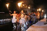 参加者は巨大なろうそくを抱えた男衆を先頭に、参道を駆け抜けて社殿になだれ込み、「押ッセ、押ッセ」のかけ声で押し合いが始まった。