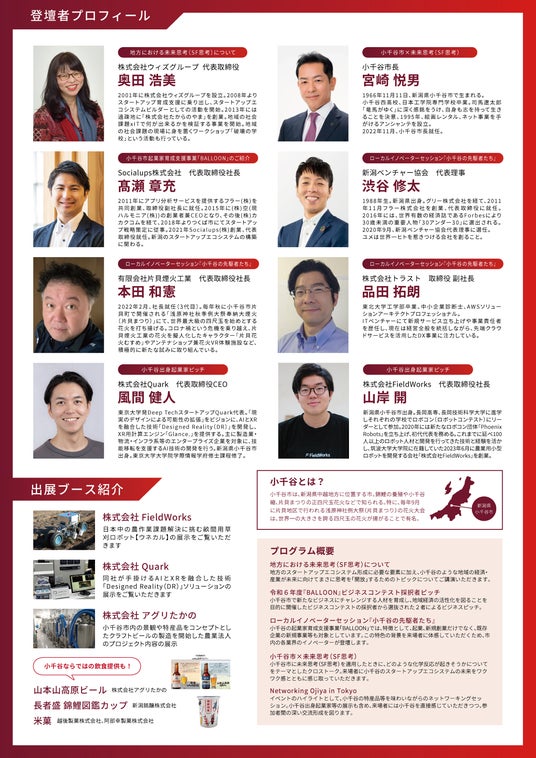 小千谷のイノベーターの登壇や、小千谷のような地域の経済・産業が発展する「未来」を見据えた、地方のスタートアップエコシステム形成に必要な要素に関する議論、交流を通じて、ご来場者の思考をより柔軟に「開放」し、小千谷、地方の明日に繋がるアクションを生み、アイデアを持ち帰っていただける機会といたします。