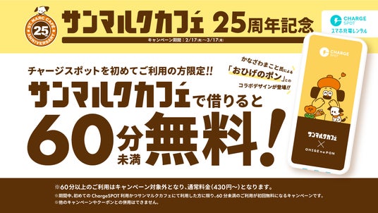また、期間中にサンマルクカフェ店舗でモバイルバッテリーを借りると、はじめて「ChargeSPOT」を利用するユーザーに限り、60分未満の利用が無料となるお得なキャンペーンも実施します。