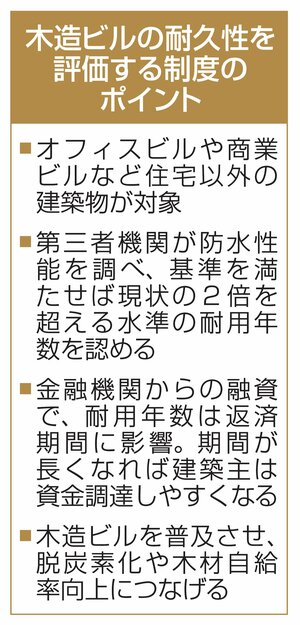 社会 木造ビルの普及後押しへ、国交省が耐久性評価を制度化 基準満たせば現状の2倍超の耐用年数認定 2025/2/16 14:30 国土交通省は、木造ビルの耐久性を評価する制度を設ける。第三者機関が防水性能を調べ、基準を満たせば現状の2倍を超える水準の耐用年数を認める仕組み。クリアした場合、建築主が資金調達しやすくなるとみられ、木造... 残り576文字(全文:678文字) ここから先を読むには 続きを読む(会員登録する) 続きを読む(ログイン) 新潟日報朝刊を購読していますか? はい いいえ トップページで最新情報を見る 関連ニュース 止まらぬクマ被害、対策へ財源や担い手確保を 新潟県など「北海... 15:30 三条市下田地域の5小学校統合案、2033年度以降は中学校校舎... 15:00 [クマ目撃情報]村上市、阿賀野市、柏崎市、南魚沼市、上越市(... 11:30 思い出の学びやに感謝と惜別…上越市・久比岐高校で閉校式典、体... 11:15 開志国際高校(胎内市)グラウンド近くの路上でクマ目撃 10:55 魚沼市、市有地を最大98.8%値値引きし4件売却 買い手付か... 8:00 平和の重要性強く訴え 県弁護士会、防衛費増額、安保関連3文書... 7:00 貴重な資料を未来へどう残す?マイクロフィルム生産終了へ、県立... 11/6 燕市の工場敷地内の地下水から基準値超の鉛検出、健康被害確認さ... 11/6 特殊詐欺の「かけ子」に勧誘か、男逮捕 「行き先はラオス」など... 11/6 糸魚川のナメコからセシウム検出、基準値は下回る 11/6 児童ポルノ製造容疑で新潟市中央区の男を逮捕、10代女性に裸の... 11/6